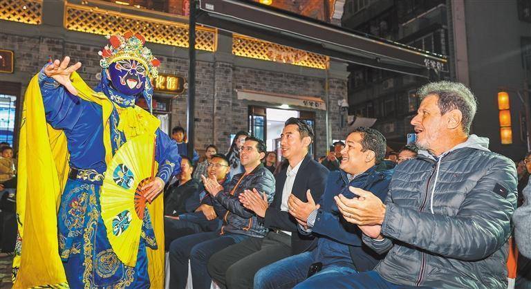 11月20日,湖北省襄阳古城管家巷,外国游客在观看川剧变脸表演。杨 东摄(中经视觉)