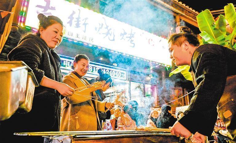 11月28日,游客在江西省靖安县双溪镇西门古街品尝美食。当地打造夜间文旅消费新业态,激活古镇夜经济。 鲍赣生摄(中经视觉)