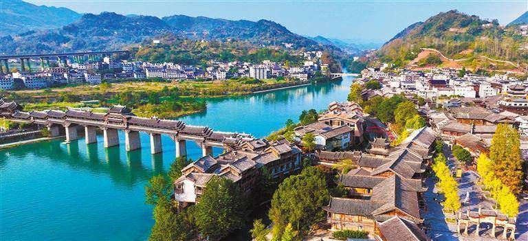 11月16日,重庆市黔江区濯水古镇,土家吊脚楼群落、水运码头和碧水蓝天相映成景。 杨 敏摄(中经视觉)