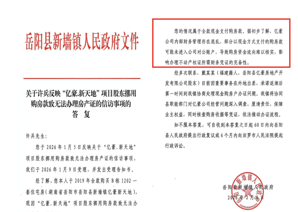 2026年2月6日,岳阳县新墙镇政府回复许先生称,他的情况属于全款现金支付购房款,据初步了解,开发商内部财务管理存在混乱,部分以现金方式支付的购房款可能未进入该公司对公账户,导致购房资金流向难以核实,影响办理不动产权证所需财务凭证的完备性。