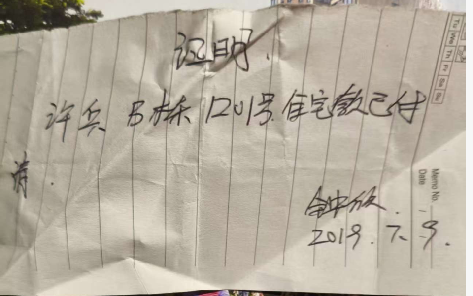 承建商钟欣的手写收款证明,图为许先生提供