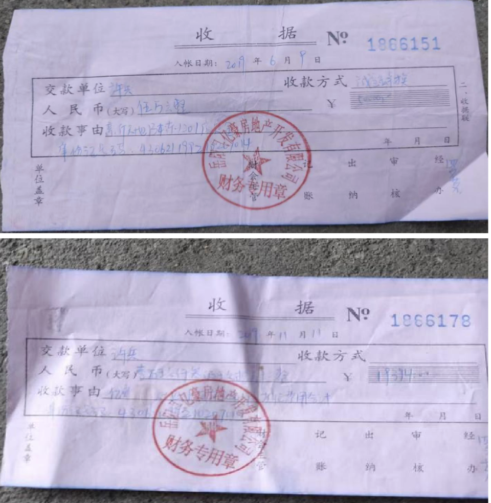 根据许先生提供的收据,开发商于2019年7月9日、11月11日、11月26日向许先生出具了付款收据,其中11月26日出具的收据45.561万元为房款,每张收据上都加盖了岳阳县亿豪房地产开发有限公司财务专用章。“我当时挺放心的,觉得有合同有收据,开发商也认了,应该没问题。”许先生回忆道。