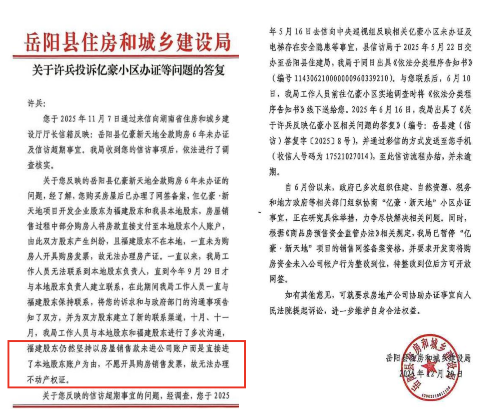 2025年12月29日,岳阳县住房和城乡建设局书面回复许先生说,他购买的房屋已办理网签备案手续,但该项目开发企业是由福建股东和岳阳县本地股东共同开发,房屋销售过程中部分购房人将房款直接支付至本地股东个人账户,导致双方股东产生纠纷,且福建股东不在岳阳县当地,一直未为购房人开具购房发票,故无法办理房产证。目前多部门已成立专班组,研究具体举措解决此事。