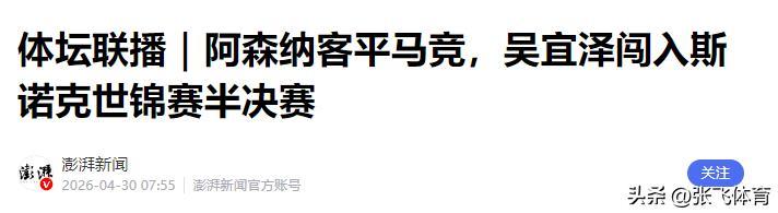 澎湃新闻——体坛联播|阿森纳客平马竞,吴宜泽闯入斯诺克世锦赛半决赛