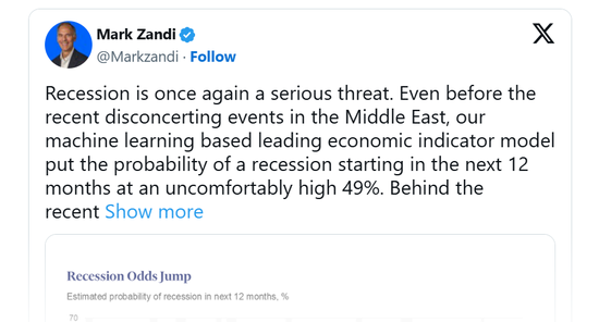 赞迪在社交平台X上发文称:“经济衰退再次成为严重威胁。”